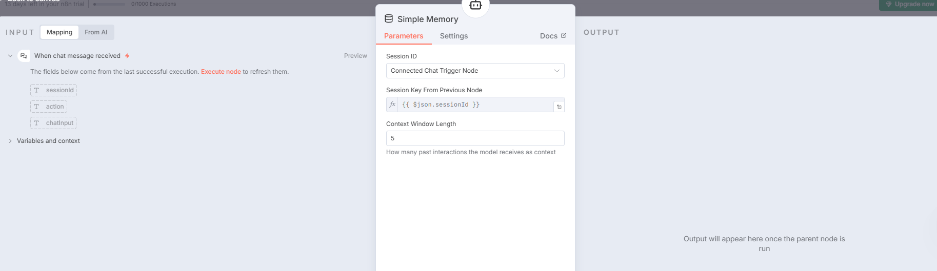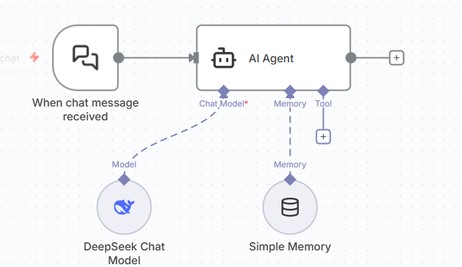 我们可以在 Agent 下面的 Memory 节点添加记忆模块,它的作用是,如果我继续发送消息,它会记住我之前的对话。