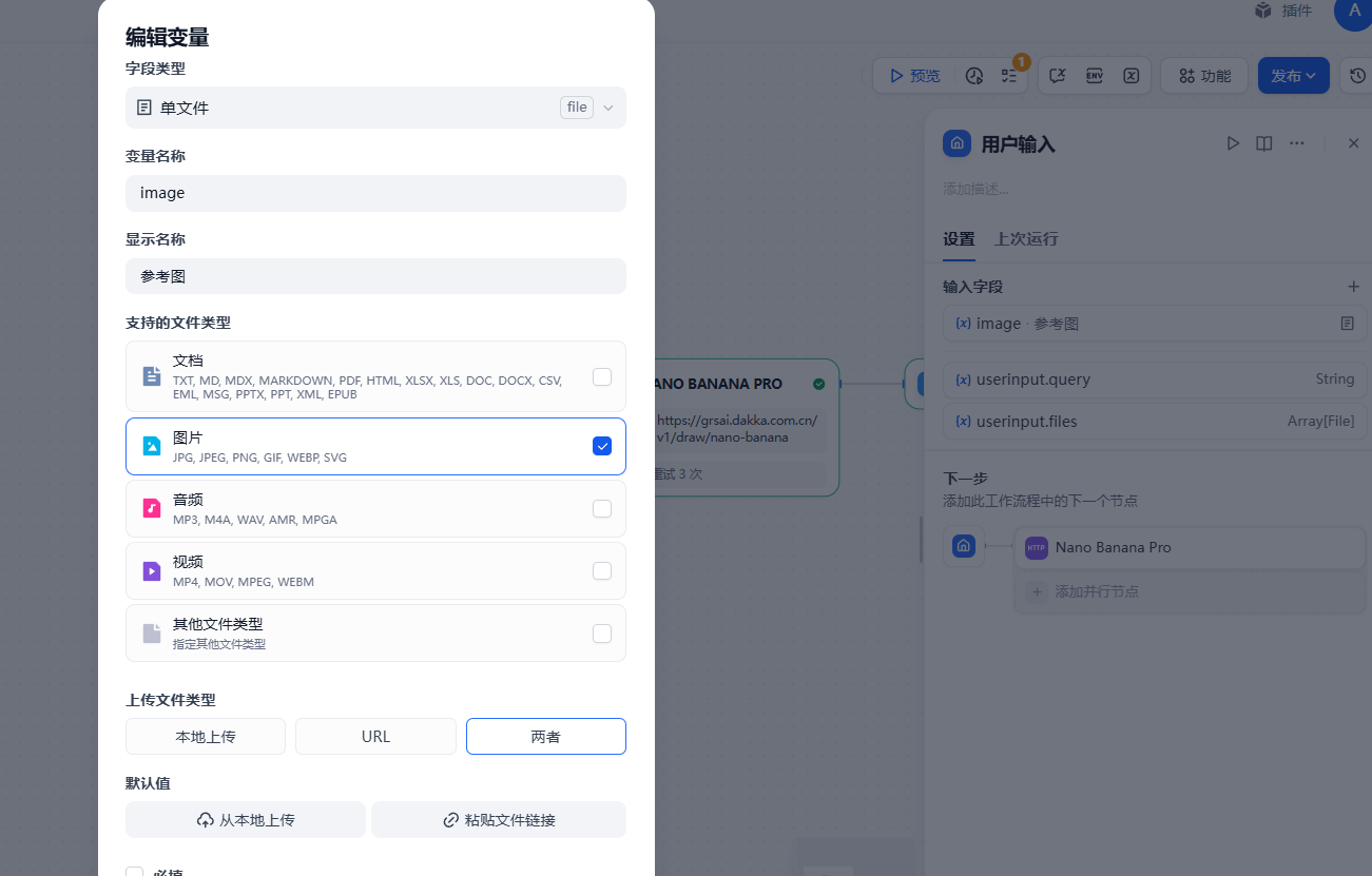 用户输入这块,设置一个可文件上传的输入接口;支持后续上传参考图进行图生图。