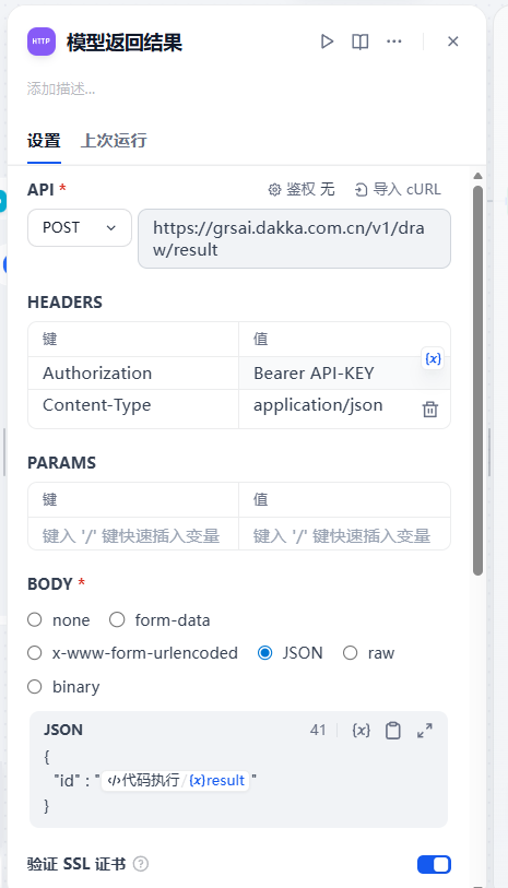 我们加入HTTP 请求节点,并根据Grsai API 提供的文档进行设置: