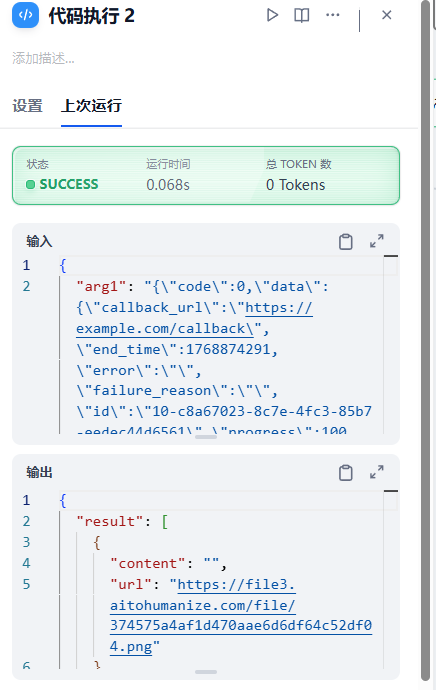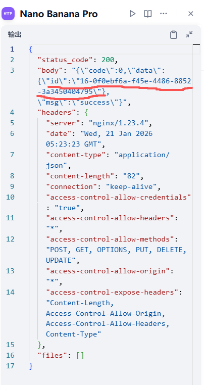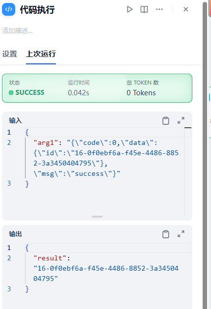 由于id被放在body键的字符串值当中,因此额外加入一个代码执行节点,将这个值取出来,用于后续的结果获取接口。
