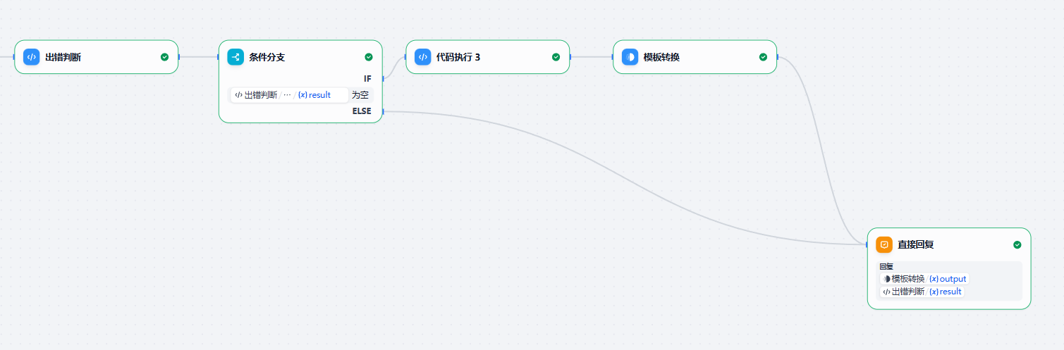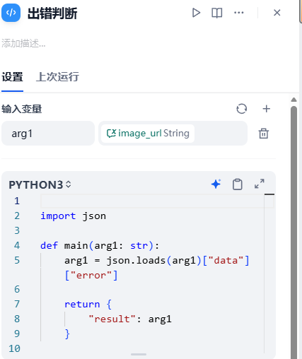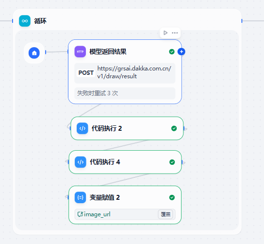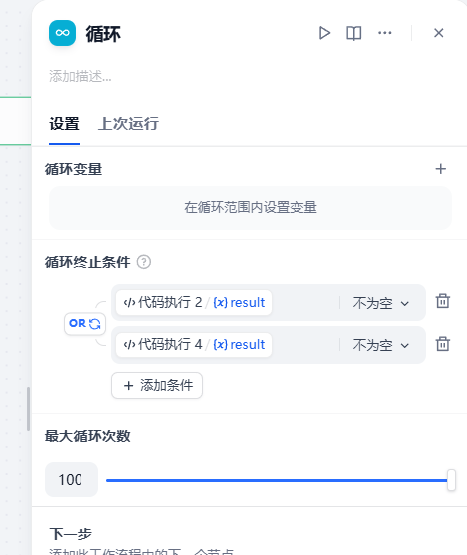 如果只通过results去判断是否结束循环,还会出现一个问题,那就是如果参数配置错误、又或许是接口出现异常而报错,results依然是null,但模型生成已经因为异常而停止生成了,因此我们需要加入额外的异常获取添加到循环的判断中,确保工作流流畅的运行: